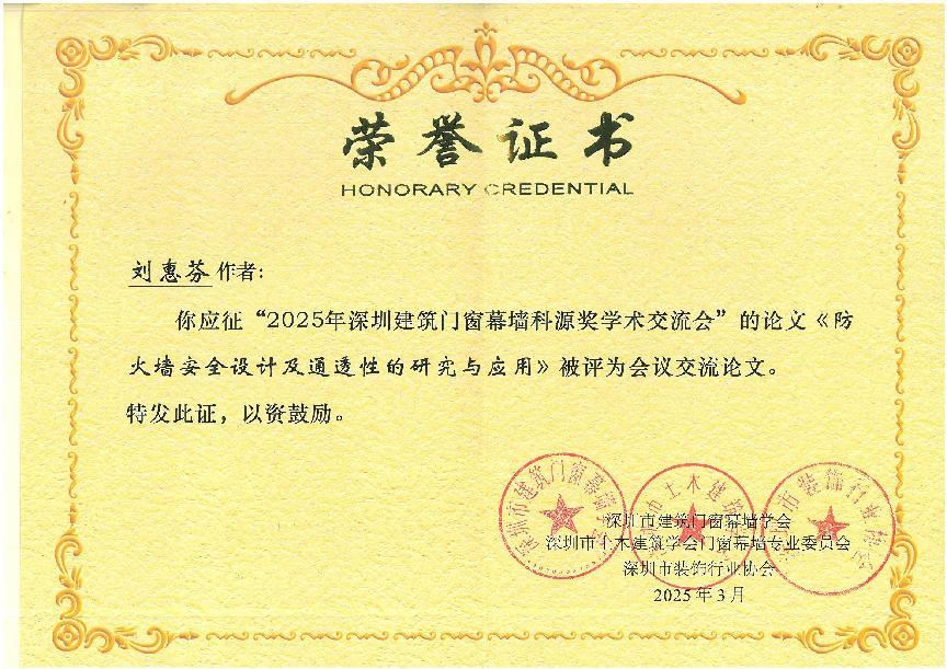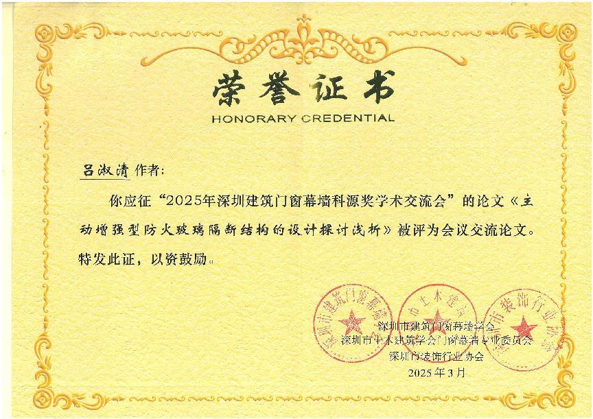 在2025科源獎獲獎學術論文及學術交流先進單位頒獎儀式中,恒保公司共3篇論文榮獲學會表彰,其中工程師勞梓明撰寫的《防火玻璃門承載密封隔熱優(yōu)化的分析和應用》被評為《現(xiàn)代建筑門窗幕墻技術與應用——2025科源獎論文集》入選論文!