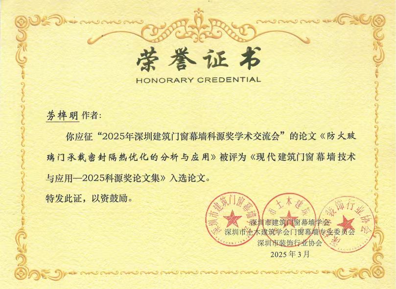 在2025科源獎獲獎學術論文及學術交流先進單位頒獎儀式中,恒保公司共3篇論文榮獲學會表彰,其中工程師勞梓明撰寫的《防火玻璃門承載密封隔熱優(yōu)化的分析和應用》被評為《現(xiàn)代建筑門窗幕墻技術與應用——2025科源獎論文集》入選論文!